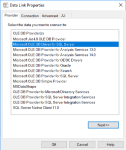 With Microsoft OLE DB Driver for SQL Server as provider the connection could be established successfully!